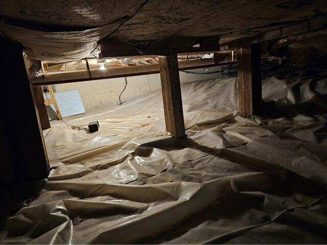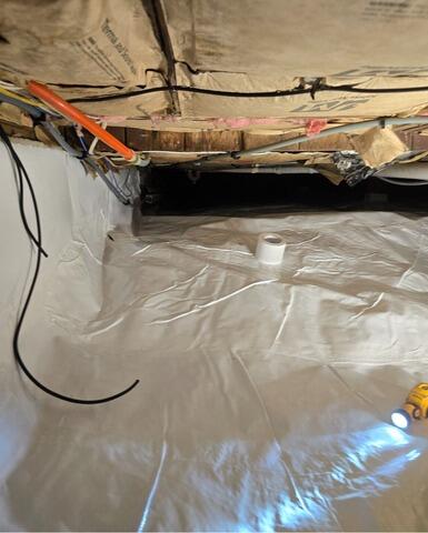 Homeowners in Oquossoc, Maine previously had a thin plastic layer installed in their crawl space to attempt to offer moisture protection. They found during heavy rains that water was coming in and getting very close to their electrical and septic systems. They contacted TC Hafford Basement Systems for help properly encapsulating the crawl space. We installed our two-step encapsulation system, consisting of drainage matting and CleanSpace vapor barrier. Drainage matting controls the groundwater flow, while the CleanSpace liner is installed above to seal moisture out of the crawl space. CleanSpace is made of an inorganic material, which also helps prevent mold growth.