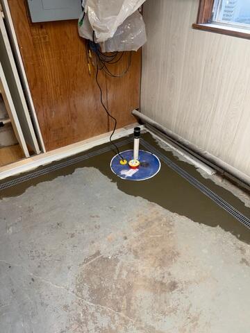 Once our installation crew arrived at the home, they began work on the basement right away. A shallow trench was excavated in the perimeter of the basement flooor to allow for the WaterGuard piping to be laid. Loose rocks and concrete were used to seal the pipes within the floor without hindering their function. The WaterGuard inside the basement floor will now collect any leaking moisture and guide it to the sump to be removed. Within the sump, we installed a SmartSump pump to force any water up and out of the home through a PVC discharge line.