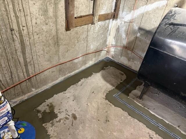 Once our installation crew arrived at the home, they got started with this waterproofing job by installing a SuperSump in the floor of this basement. Nearby, an UltraSump backup battery was installed and connected to the SuperSump. The SuperSump will act to pump and water from this basement up and out of the home through a PVC discharge line at a rate of 2,650 gallons of water every hour. To help keep the sump operational even in the harshest storms, the nearby UltraSump will activate during power-outages. The UltraSump will enable the SuperSump to function for around 11,000 gallons of water-removal.