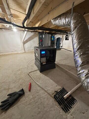Once our installation crew got to the home, they began by installing a TripleSafe sump pump in the floor of the basement. This device houses three pumps within itself. The first and second pumps handle the majority of the water needing to be removed. The third pump is a battery backup pump, which will switch on in the event of a power-outage. A SaniDry XP dehumidifier was also installed nearby. The SaniDry will pull in the damp air from around the basement, separating the moisture from it. The dried air is circulated back into the basement while the collected water is passed to the TripleSafe for removal.