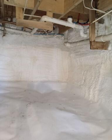 We helped homeowners in Bath, Maine to encapsulate their wet crawl space. The crawl space had no insulation and water was coming in, which can lead to larger structural problems for the home like mold or wood rot. We installed our two-step encapsulation which includes a layer of drainage matting followed by our CleanSpace vapor barrier liner. CleanSpace seals out moisture, and is treated to prevent mold growth. We also installed Spray Foam insulation on the walls and rim joists. Spray Foam immediately improves the energy efficiency of the home, and it is water resistant, making it a great option for crawl spaces.