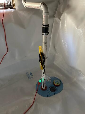 As soon as our installation crew arrived at the home, they were able to go straight to the crawlspace and begin work. To eliminate any moisture build-up in the atmosphere within the crawlspace, a SaniDry Sedona dehumidifier was placed in the space. This device will pull in the damp air surrounding itself and separate the moisture from it. The dried air is then circulated back into the crawlspace where it will cycle more damp air back to the SaniDry, continuing the process until the space is free of moisture. The water that is separated from the air flows through a Condensate Pump, that forces the water out of the home through a discharge line.